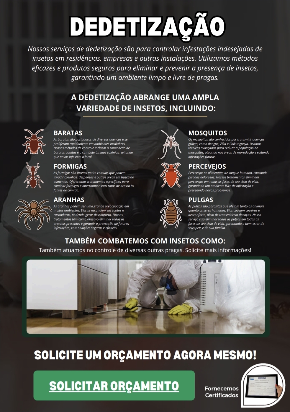 Somos uma dedetizadora especializada no controle de insetos rasteiros e voadores, como baratas, formigas, ratos, moscas, mosquitos, cupins e escorpiões. Também oferecemos serviços de higienização de caixas d'água com excelência.